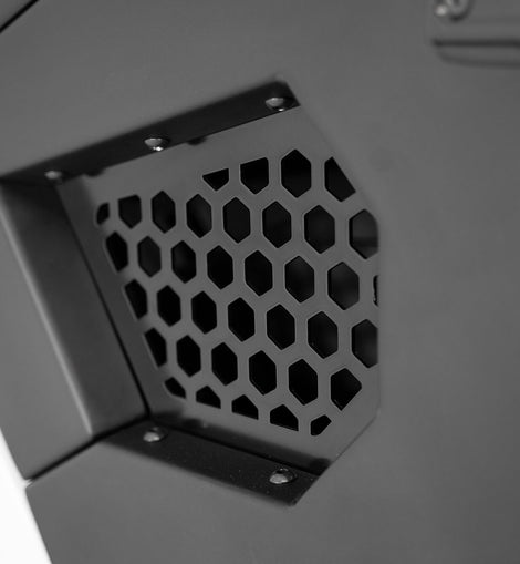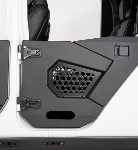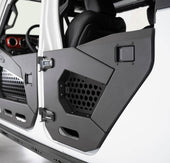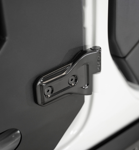 Hammer black powder coat is used on the main portion of the door with satin black powder coat on the recessed aluminum paneling.Use of bump stops holds the doors firmly in place to prevent any rattling. Genuine Mopar hinges in black are sold separately. These Jeep Wrangler JL/Jeep Gladiator JT doors are fully bolt-on and made in America
